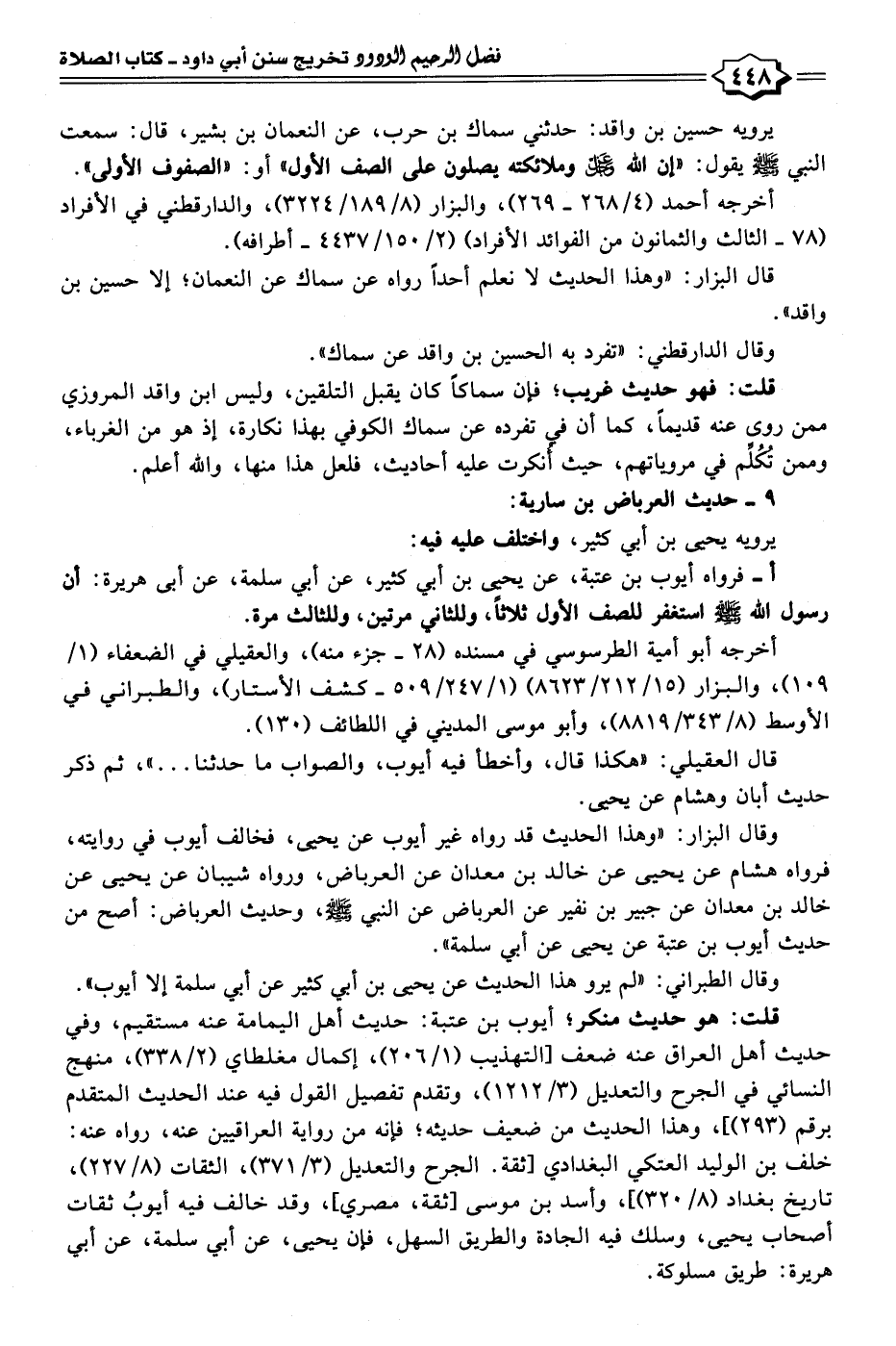 يرويه حسين بن واقد: حدثني سماك بن حرب، عن النعمان بن بشير، قال: سمعت النبي - صلى الله عليه وسلم - يقول: "إن الله عز وجل وملائكته يصلون على الصف الأول" أو: "الصفوف الأولى".