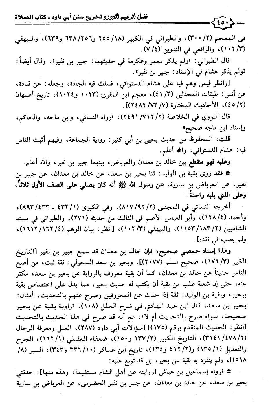 • فقد روى بقية بن الوليد: ثنا بحير بن سعد، عن خالد بن معدان، عن جبير بن نفير، عن العرباض بن ساربة، عن رسول الله - صلى الله عليه وسلم - أنه كان يصلي على الصف الأول ثلاثًا، وعلى الذي يليه واحدةً.