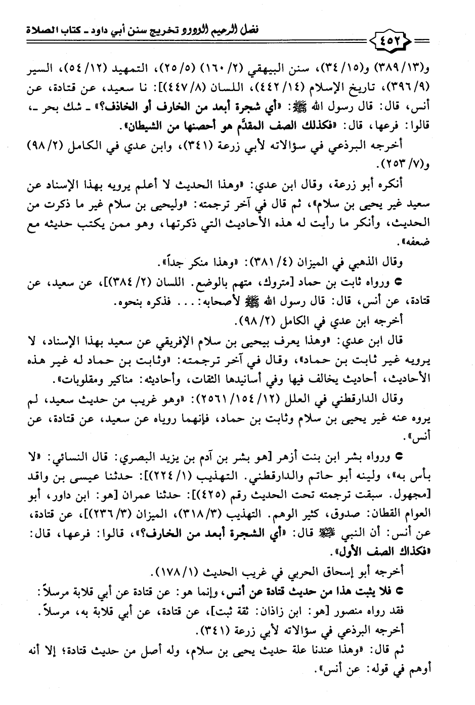 و (١٣/ ٣٨٩) و (١٥/ ٣٤)، سنن البيهقي (٢/ ١٦٠) (٥/ ٢٥)، التمهيد (١٢/ ٥٤)، السير (٩/ ٣٩٦)، تاريخ الإسلام (١٤/ ٤٤٢)، اللسان (٨/ ٤٤٧)]: نا سعيد، عن قتادة، عن أنس، قال: قال رسول الله - صلى الله عليه وسلم -: "أي شجرة أبعد من الخارف أو الخاذف؟ " -شك بحر-، قالوا: فرعها، قال: "فكذلك الصف المقدَّم هو أحصنها من الشيطان".