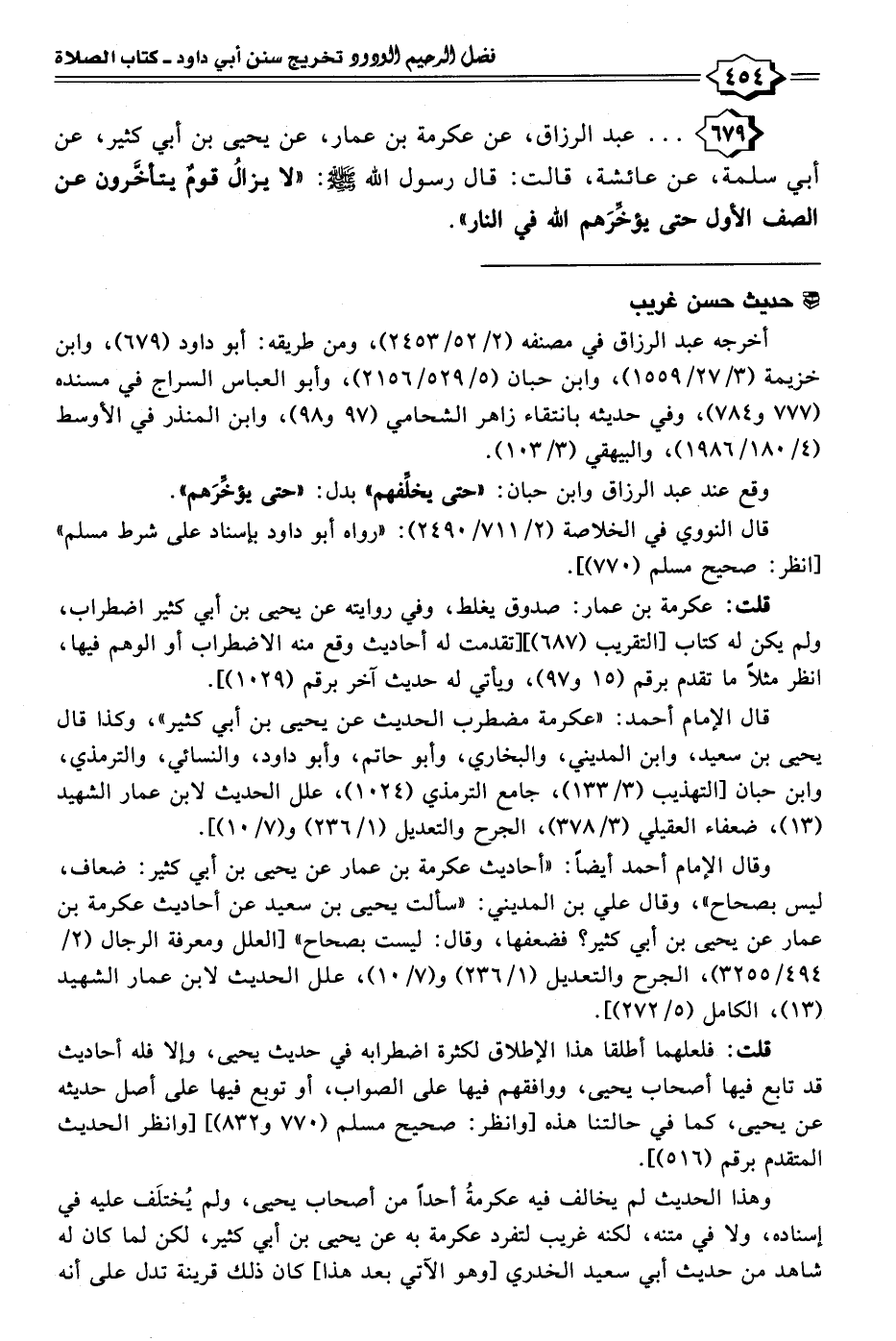 ٦٧٩ - . . . عبد الرزاق، عن عكرمة بن عمار، عن يحيى بن أبي كثير، عن أبي سلمة، عن عائشة، قالت: قال رسول الله - صلى الله عليه وسلم -: "لا يزالُ قومٌ يتأخرون عن الصف الأول حتى يؤخِّرَهم الله في النار".