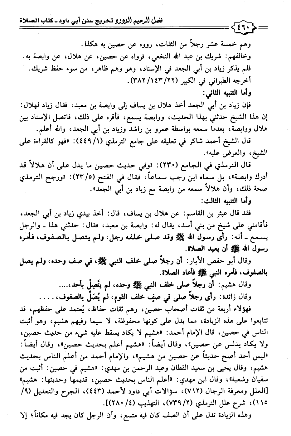 فقد قال عبثر بن القاسم: عن هلال بن يساف، قال: أخذ بيدي زياد بن أبي الجعد، فأقامني على شيخ من بني أسد، يقال له: وابصة بن معبد، فقال: حدثني هذا -والرجل يسمع- أنه: رأى رسول الله - صلى الله عليه وسلم - وقد صلى خلفه رجل، ولم يتصل بالصفوف، فأمره رسول الله - صلى الله عليه وسلم - أن يعيد الصلاة.