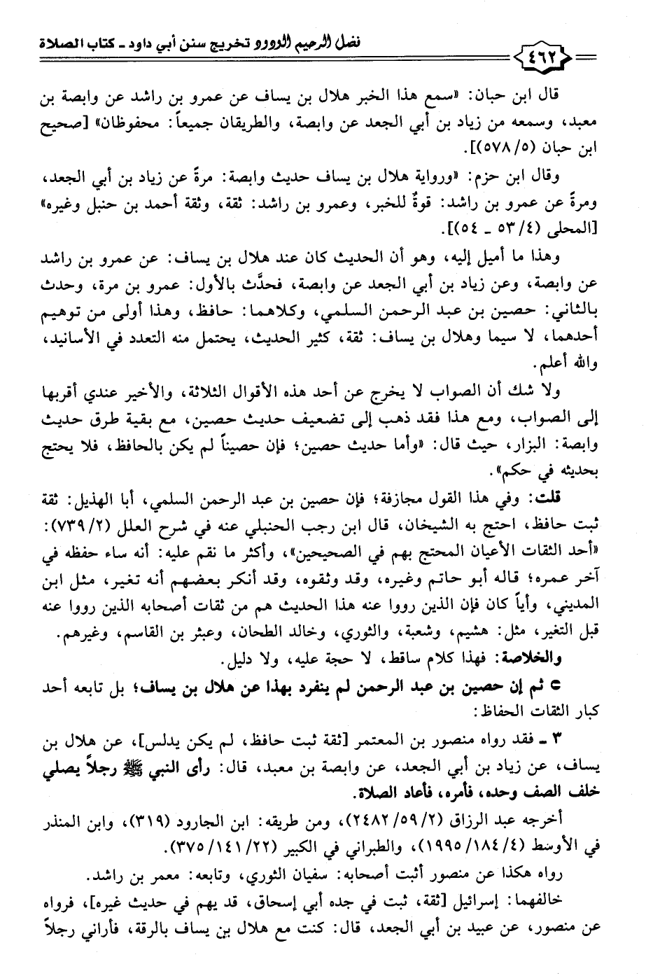 ٣ - فقد رواه منصور بن المعتمر [ثقة ثبت حافظ، لم يكن يدلس]، عن هلال بن يساف، عن زياد بن أبي الجعد، عن وابصة بن معبد، قال: رأى النبي - صلى الله عليه وسلم - رجلًا يصلي خلف الصف وحده، فأمره، فأعاد الصلاة.