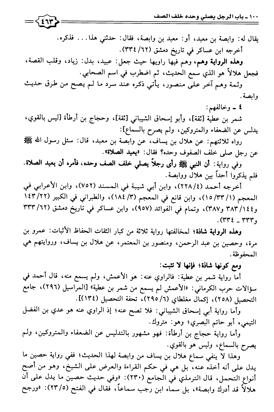 رواه ثلاثتهم: عن هلال بن يساف، عن وابصة بن معبد، قال: سئل رسول الله - صلى الله عليه وسلم - عن رجل صلى خلف الصفوف وحده؟ فقال: "يعيد الصلاة".
