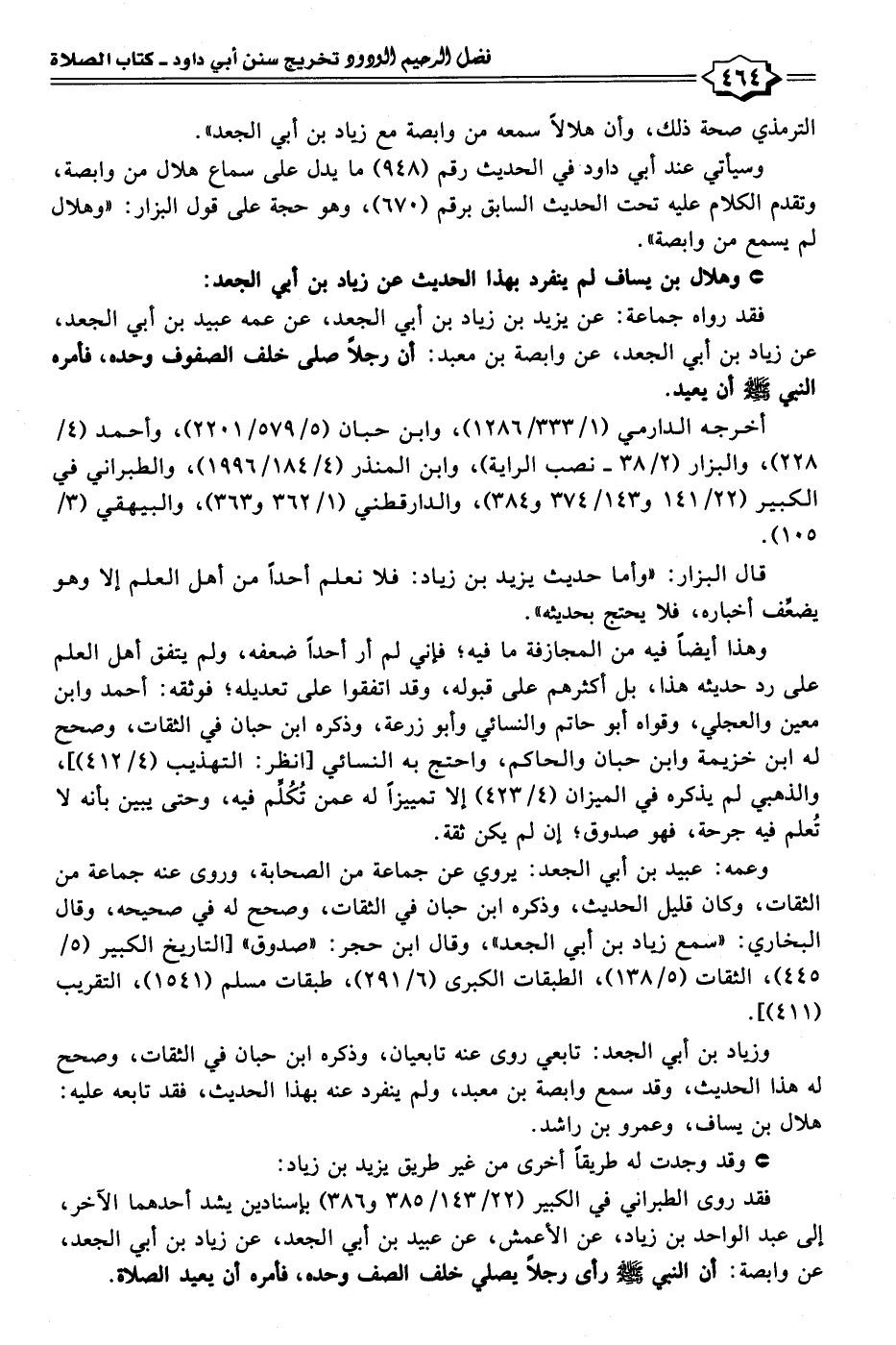 فقد رواه جماعة: عن يزيد بن زياد بن أبي الجعد، عن عمه عبيد بن أبي الجعد، عن زياد بن أبي الجعد، عن وابصة بن معبد: أن رجلًا صلى خلف الصفوف وحده، فأمره النبي - صلى الله عليه وسلم - أن يعيد.