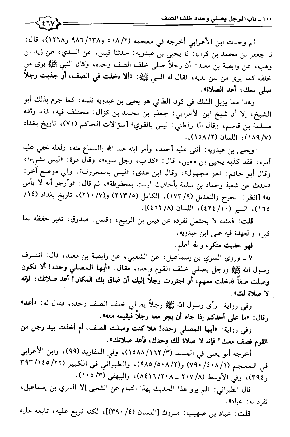 ٧ - وروى السري بن إسماعيل، عن الشعبي، عن وابصة بن معبد، قال: انصرف رسول الله - صلى الله عليه وسلم - ورجل يصلي خلف القوم وحده، فقال: "أيها المصلي وحده! ألا تكون وصلت صفًّا فدخلت معهم، أو اجتررت رجلًا إليك أن ضاق بك المكان! أعد صلاتك؛ فإنه لا صلاة لك".