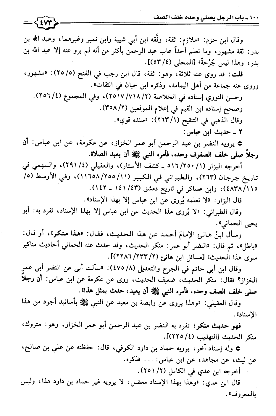 • يرويه النضر بن عبد الرحمن أبو عمر الخزاز، عن عكرمة، عن ابن عباس: أن رجلًا صلى خلف الصفوف وحده، فأمره النبي - صلى الله عليه وسلم - أن يعيد الصلاة.