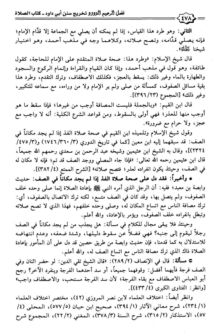 وقول شيخ الإسلام وتلميذه ابن القيم في صحة صلاة الفذ إذا لم يجد مكانًا في الصف: قد سبقهما إليه ابن معين [كما في تاريخ الدوري (٣/ ٣٦٠/ ١٧٤٦) و (٣/ ٤٧٥/ ٢٣٢٤)]، وقال به الشيخ ابن عثيمين وشيخه عبد الرحمن بن سعدي رحمهم الله جميعًا، قال ابن عثيمين رحمه الله تعالى: "فإذا جاء المصلي ووجد الصف قد تم؛ فإنه لا مكان له في الصف، وحينئذ يكون انفراده لعذر؛ فتصح صلاته" [الشرح الممتع (٤/ ٣٨٢)].