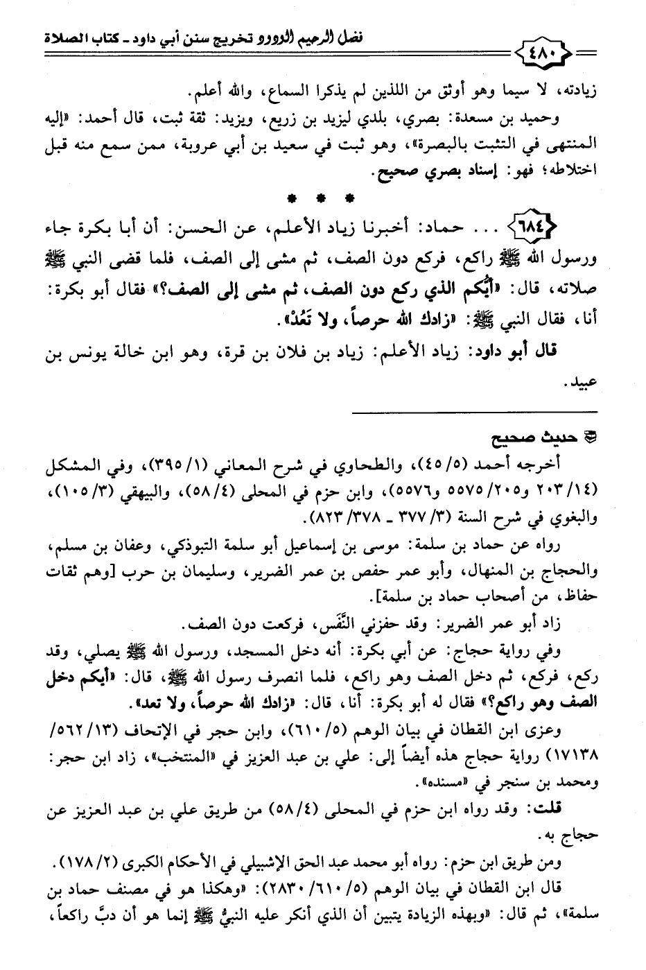٦٨٤ - . . . حماد: أخبرنا زياد الأعلم، عن الحسن: أن أبا بكرة جاء ورسول الله - صلى الله عليه وسلم - راكع، فركع دون الصف، ثم مشى إلى الصف، فلما قضى النبي - صلى الله عليه وسلم - صلاته، قال: "أيُّكم الذي ركع دون الصف، ثم مشى إلى الصف؟ " فقال أبو بكرة: أنا، فقال النبي - صلى الله عليه وسلم -: "زادك الله حرصًا، ولا تَعُدْ".