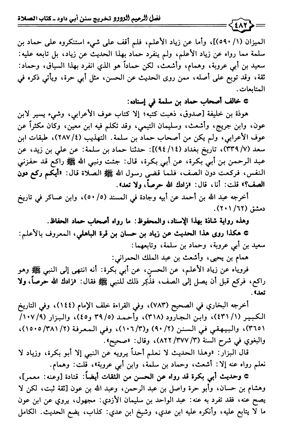 هوذة بن خليفة [صدوق، ذهبت كتبه؛ إلا كتاب عوف الأعرابي، وشيء يسير لابن عون، وابن جريج، وأشعث، وسليمان التيمي، وقد تكلم فيه ابن معين، وكان مكثرًا عن عوف الأعرابي، ولم يكن من أصحاب حماد بن سلمة. التهذيب (٤/ ٢٨٧)، طبقات ابن سعد (٧/ ٣٣٩)، تاريخ بغداد (١٤/ ٩٤)]: حدثنا حماد بن سلمة: عن علي بن زيد، عن عبد الرحمن بن أبي بكرة، عن أبي بكرة، قال: جئت ونبي الله - صلى الله عليه وسلم - راكع قد حفزني النفس، فركعت دون الصف، فلما قضى رسول الله - صلى الله عليه وسلم - الصلاة قال: "أيكم ركع دون الصف؟ " قلت: أنا، قال: "زادك الله حرصًا، ولا تعد".