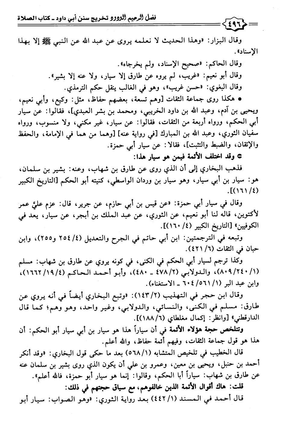 • هكذا روى جماعة الثقات [وهم تسعة، بعضهم حفاظ، مثل: وكيع، وأبي نعيم، ويحيى بن آدم، وعبد الله بن داود الخريبي، ومحمد بن بشر العبدي]، فقالوا: عن سيار أبي الحكم، ورواه أربعة من الثقات، فقالوا: عن سيار، غير مكني، ولا منسوب، ورواه سفيان الثوري، وعبد الله بن المبارك [في رواية عنه] [وهما من هما في الإمامة، والحفظ والإتقان، والضبط والتثبت]، فقالا: عن سيار أبي حمزة.