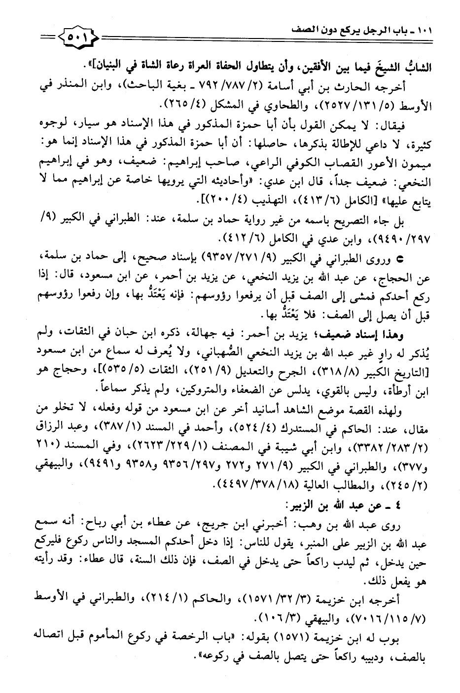 • وروى الطبراني في الكبير (٩/ ٢٧١/ ٩٣٥٧) بإسناد صحيح، إلى حماد بن سلمة، عن الحجاج، عن عبد الله بن يزيد النخعي، عن يزيد بن أحمر، عن ابن مسعود، قال: إذا ركع أحدكم فمشى إلى الصف قبل أن يرفعوا رؤوسهم: فإنه يَعْتَدُّ بها، وإن رفعوا رؤوسهم قبل أن يصل إلى الصف: فلا يَعْتَدُّ بها.