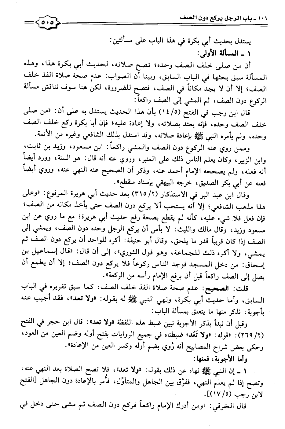 قلت: الصحيح: عدم صحة صلاة الفذ خلف الصف، كما سبق تقريره في الباب السابق، وأما حديث أبي بكرة، ونهي النبي - صلى الله عليه وسلم - له بقوله: "ولا تعد"، فقد أجيب عنه بأجوبة، نذكر منها ما يتعلق بمسألة الباب: