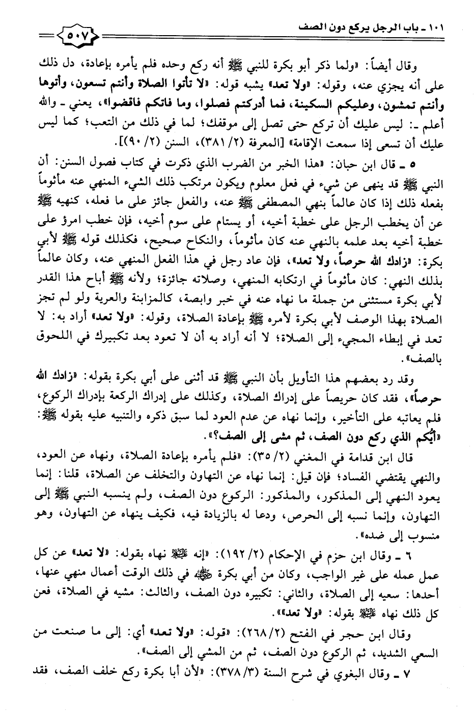 ٦ - وقال ابن حزم في الاحكام (٢/ ١٩٢): "إنه عليه السلام نهاه بقوله: "لا تعد" عن كل عمل عمله على غير الواجب، وكان من أبي بكرة - رضي الله عنه - في ذلك الوقت أعمال منهي عنها، أحدها: سعيه إلى الصلاة، والثاني: تكبيره دون الصف، والثالث: مشيه في الصلاة، فعن كل ذلك نهاه عليه السلام بقوله: "ولا تعد"".