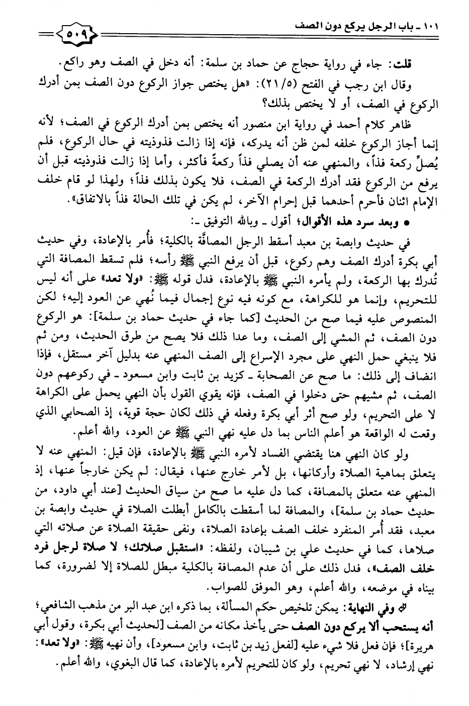 • وفي النهاية: يمكن تلخيص حكم المسألة، بما ذكره ابن عبد البر من مذهب الشافعي؛ أنه يستحب ألا يركع دون الصف حتى يأخذ مكانه من الصف [لحديث أبي بكرة، وقول أبي هريرة]؛ فإن فعل فلا شيء عليه [لفعل زيد بن ثابت، وابن مسعود]، وأن نهيه - صلى الله عليه وسلم -: "ولا تعد": نهي إرشاد، لا نهي تحريم، ولو كان للتحريم لأمره بالإعادة، كما قال البغوي، والله أعلم.