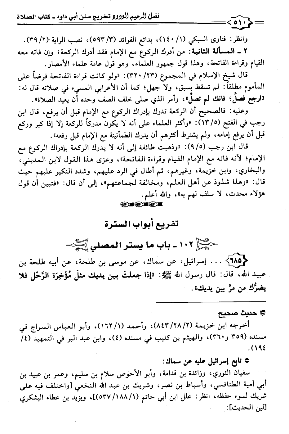 ٦٨٥ - . . . إسرائيل، عن سماك، عن موسى بن طلحة، عن أبيه طلحة بن عبيد الله، قال: قال رسول الله - صلى الله عليه وسلم -: "إذا جعلتَ بين يديك مثلَ مُؤْخِرَة الرَّحْل فلا يضرُّك من مرَّ بين يديك".