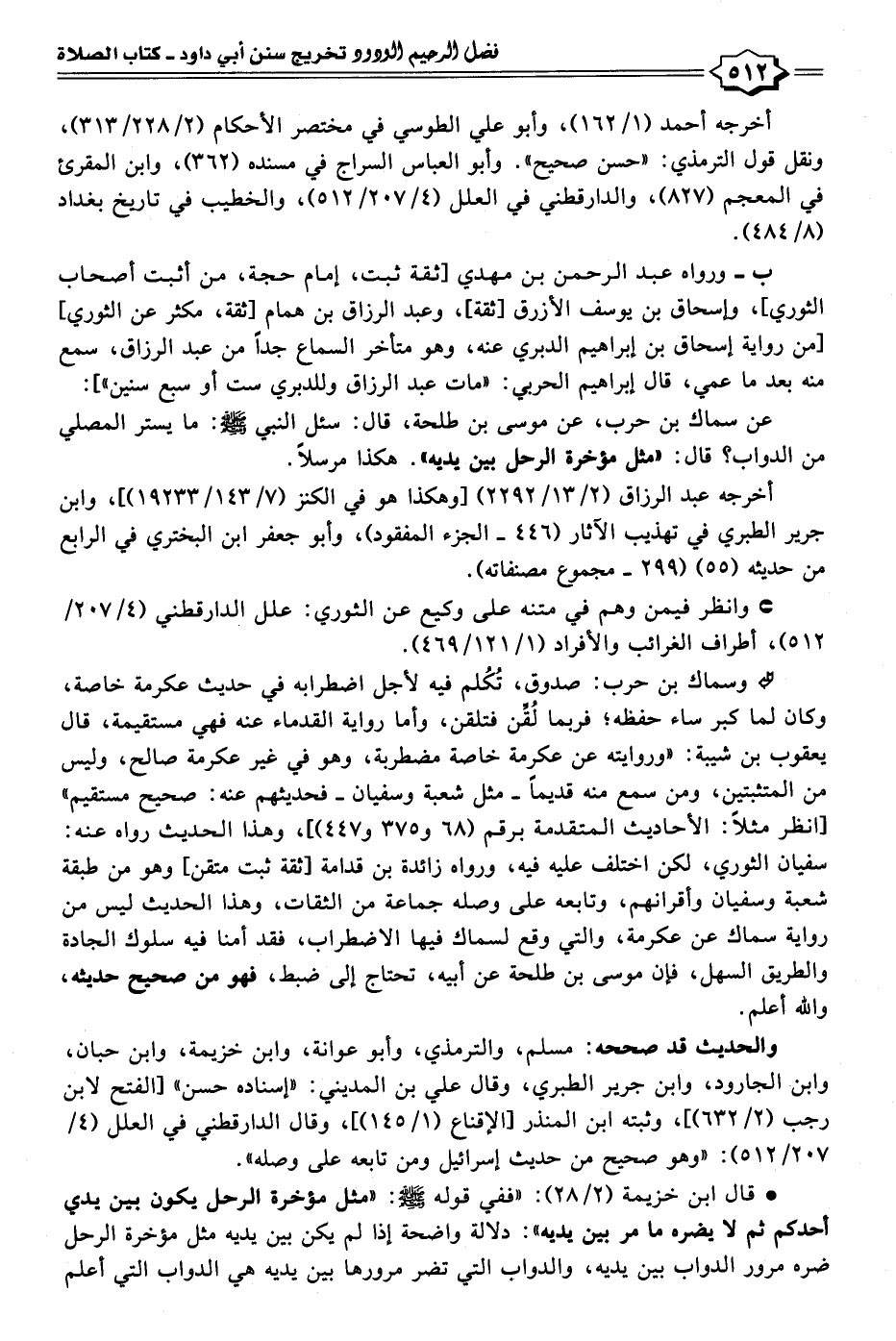 • وسماك بن حرب: صدوق، تُكُلم فيه لأجل اضطرابه في حديث عكرمة خاصة، وكان لما كبر ساء حفظه؛ فربما لُقِّن فتلقن، وأما رواية القدماء عنه فهي مستقيمة، قال يعقوب بن شيبة: "وروايته عن عكرمة خاصة مضطربة، وهو في غير عكرمة صالح، وليس من المتثبتين، ومن سمع منه قديمًا -مثل شعبة وسفيان- فحديثهم عنه: صحيح مستقيم" [انظر مثلًا: الأحاديث المتقدمة برقم (٦٨ و ٣٧٥ و ٤٤٧)]، وهذا الحديث رواه عنه: سفيان الثوري، لكن اختلف عليه فيه، ورواه زائدة بن قدامة [ثقة ثبت متقن] وهو من طبقة شعبة وسفيان وأقرانهم، وتابعه على وصله جماعة من الثقات، وهذا الحديث ليس من رواية سماك عن عكرمة، والتي وقع لسماك فيها الاضطراب، فقد أمنا فيه سلوك الجادة والطريق السهل، فإن موسى بن طلحة عن أبيه، تحتاج إلى ضبط، فهو من صحيح حديثه، والله أعلم.