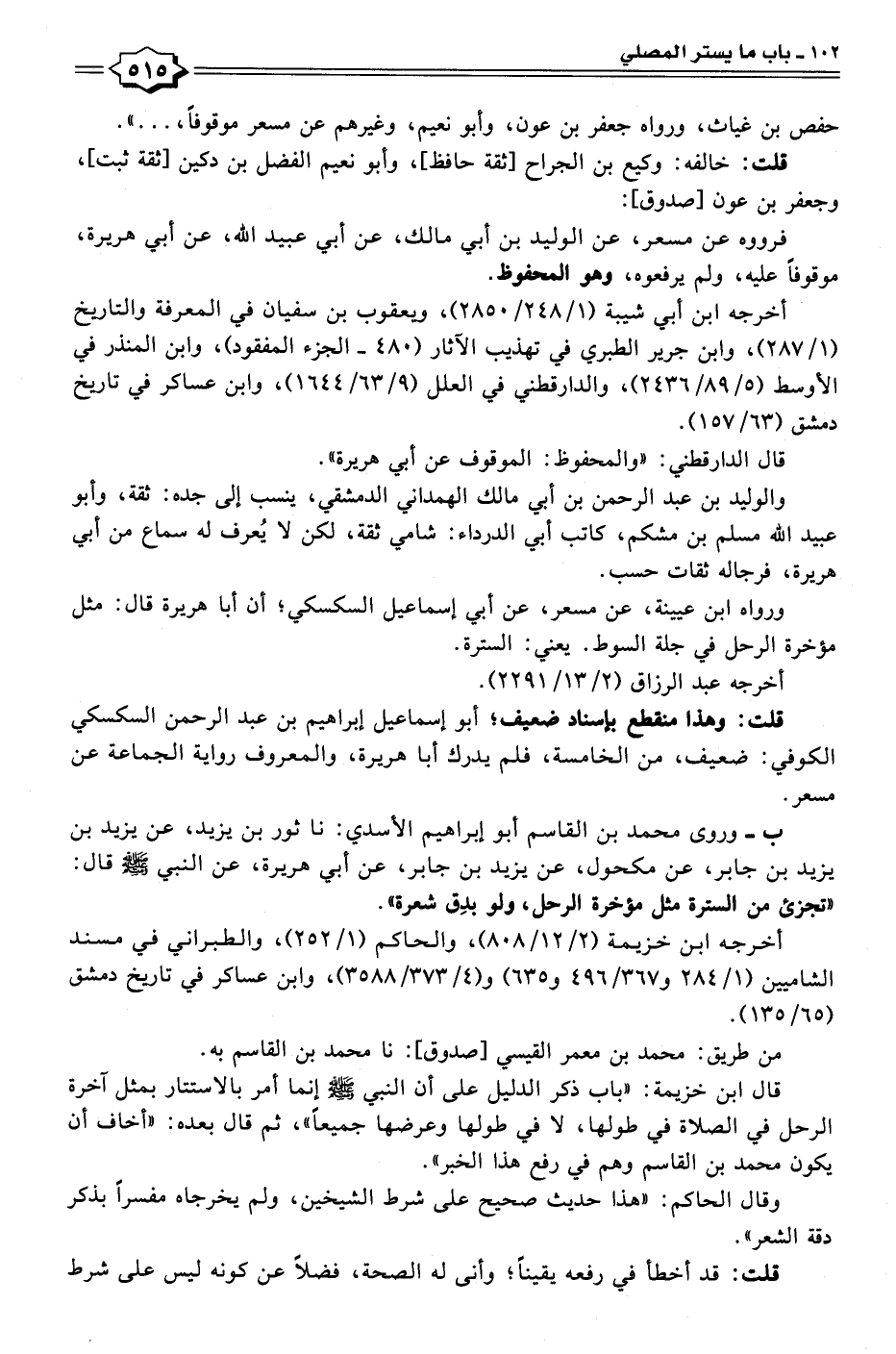 ب- وروى محمد بن القاسم أبو إبراهيم الأسدي: نا ثور بن يزيد، عن يزيد بن يزيد بن جابر، عن مكحول، عن يزيد بن جابر، عن أبي هريرة، عن النبي - صلى الله عليه وسلم - قال: "تجزئ من السترة مثل مؤخرة الرحل، ولو بدِق شعرة".