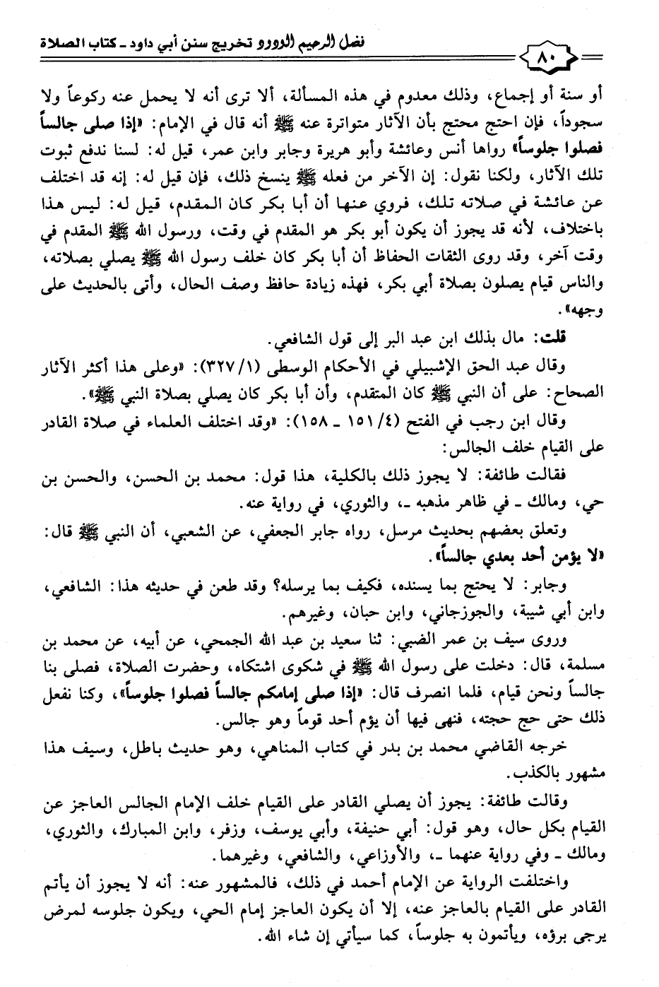 وقال ابن رجب في الفتح (٤/ ١٥١ - ١٥٨): "وقد اختلف العلماء في صلاة القادر على القيام خلف الجالس: