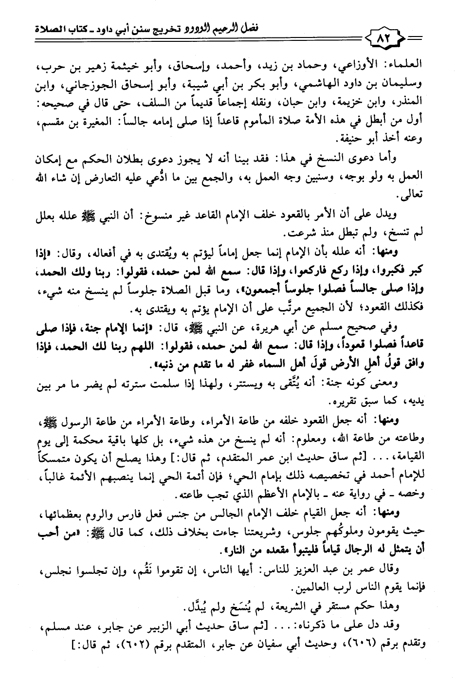 ومنها: أنه علله بأن الإمام إنما جعل إمامًا ليؤتم به ويُقتدى به في أفعاله، وقال: "إذا كبر فكبروا، وإذا ركع فاركعوا، وإذا قال: سمع الله لمن حمده، فقولوا: ربنا ولك الحمد، وإذا صلى جالسًا فصلوا جلوسًا أجمعون"، وما قبل الصلاة جلوسًا لم ينسخ منه شيء، فكذلك القعود؛ لأن الجميع مرتَّب على أن الإمام يؤتم به ويقتدى به.