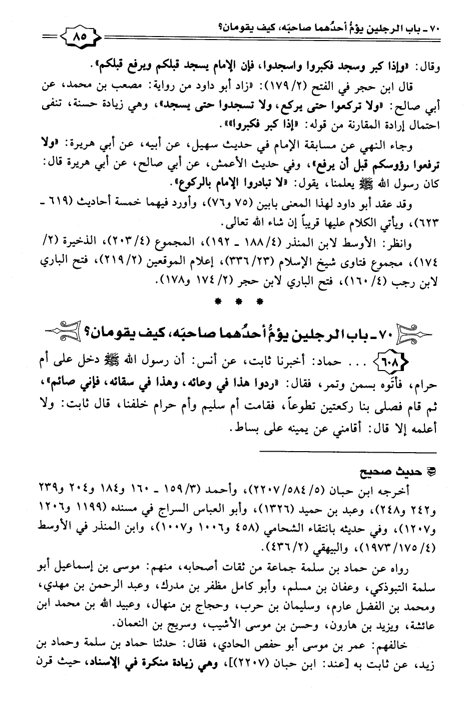 وجاء النهي عن مسابقة الإمام في حديث سهيل، عن أبيه، عن أبي هريرة: "ولا ترفعوا رؤوسكم قبل أن يرفع"، وفي حديث الأعمش، عن أبي صالح، عن أبي هريرة قال: كان رسول الله - صلى الله عليه وسلم - يعلمنا، يقول: "لا تبادروا الإمام بالركوع".