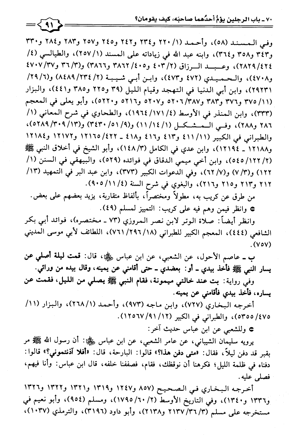 ب- عاصم الأحول، عن الشعبي، عن ابن عباس - رضي الله عنهما -، قال: قمت ليلة أصلي عن يسار النبي - صلى الله عليه وسلم - فأخذ بيدي -أو: بعضدي- حتى أقامني عن يمينه، وقال بيده من ورائي.