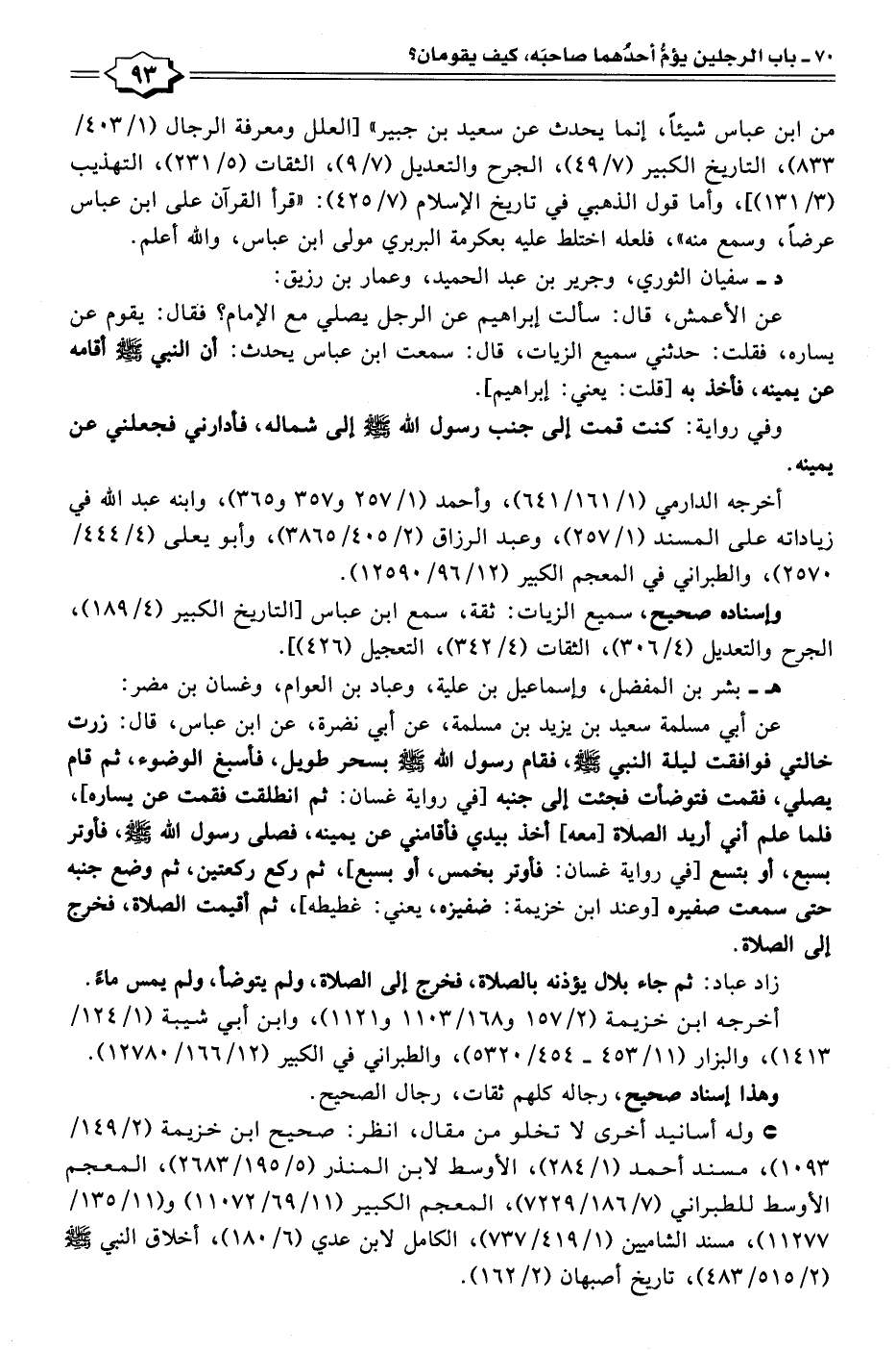عن أبي مسلمة سعيد بن يزيد بن مسلمة، عن أبي نضرة، عن ابن عباس، قال: زرت خالتي فوافقت ليلة النبي - صلى الله عليه وسلم -، فقام رسول الله - صلى الله عليه وسلم - بسحر طويل، فأسبغ الوضوء، ثم قام يصلي، فقمت فتوضأت فجئت إلى جنبه [في رواية غسان: ثم انطلقت فقمت عن يساره]، فلما علم أني أريد الصلاة [معه] أخذ بيدي فأقامني عن يمينه، فصلى رسول الله - صلى الله عليه وسلم -، فأوتر بسبع، أو بتسع [في رواية غسان: فأوتر بخمس، أو بسبع]، ثم ركع ركعتين، ثم وضع جنبه حتى سمعت صفيره [وعند ابن خزيمة: ضفيزه، يعني: غطيطه]، ثم أقيمت الصلاة، فخرج إلى الصلاة.