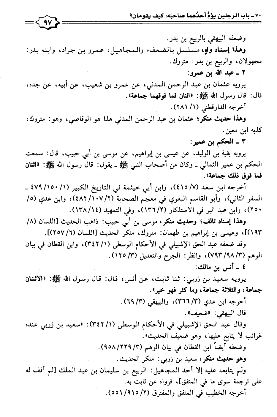 يرويه عثمان بن عبد الرحمن المدني، عن عمرو بن شعيب، عن أبيه، عن جده، قال: قال رسول الله - صلى الله عليه وسلم -: "اثنان فما فوتهما جماعة".