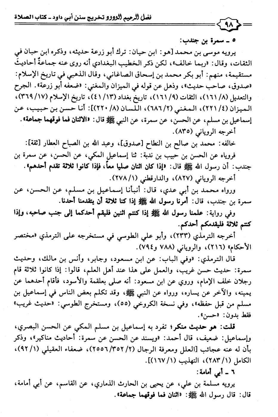 فروياه عن الحسن بن حبيب بن ندبة: ثنا إسماعيل المكي، عن الحسن، عن سمرة بن جندب: أن رسول الله - صلى الله عليه وسلم - قال: "إذا كان اثنان صليا معًا، فإذا كانوا ثلاثة تقدم أحدهم".