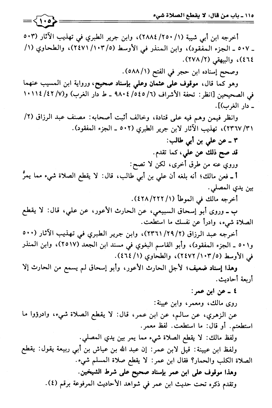ب- وروى أبو إسحاق السبيعي، عن الحارث الأعور، عن علي، قال: لا يقطع الصلاة شيء، وادرأ عن نفسك ما استطعت.