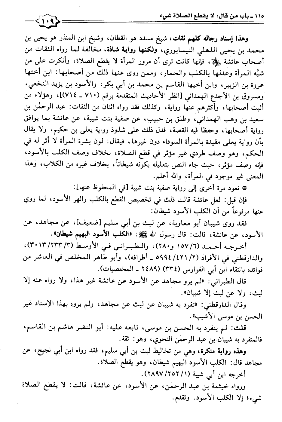 وهذا إسناد رجاله كلهم ثقات، شيخ مسدد هو القطان، وشيخ ابن المنذر هو يحيى بن محمد بن يحيى الذهلي النيسابوري، ولكنها رواية شاذة، مخالفة لما رواه الثقات من أصحاب عائشة - رضي الله عنها -، فإنها كانت ترى أن مرور المرأة لا يقطع الصلاة، وأنكرت على من شبَّه المرأة وعدلها بالكلب والحمار، وممن روى عنها ذلك من أصحابها: ابن أختها عروة بن الزبير، وابن أخيها القاسم بن محمد بن أبي بكر، والأسود بن يزيد النخعي، ومسروق بن الأجدع الهمداني [انظر الأحاديث المتقدمة برقم (٧١٠ - ٧١٤)]، وهؤلاء من أثبت أصحابها، وأكثرهم عنها رواية، وكذلك فقد رواه اثنان من الثقات: عبد الرحمن بن سعيد بن وهب الهمداني، وطلق بن حبيب، عن صفية بنت شيبة، عن عائشة بما يوافق رواية أصحابها، وحفظا فيه القصة، فدل ذلك على شذوذ رواية يعلى بن حكيم، ولا يقال بأن رواية يعلى مقيدة بالمرأة السوداء دون غيرها، فيقال: لون بشرة المرأة لا أثر له في الحكم، وهو وصف طردي غير مؤثر في قطع الصلاة، بخلاف وصف الكلب بالأسود، فإنه وصف مؤثر، حيث جاء النص بتعليله بكونه شيطانًا، بخلاف غيره من الكلاب، وهذا المعنى غير موجود في المرأة، والله أعلم.