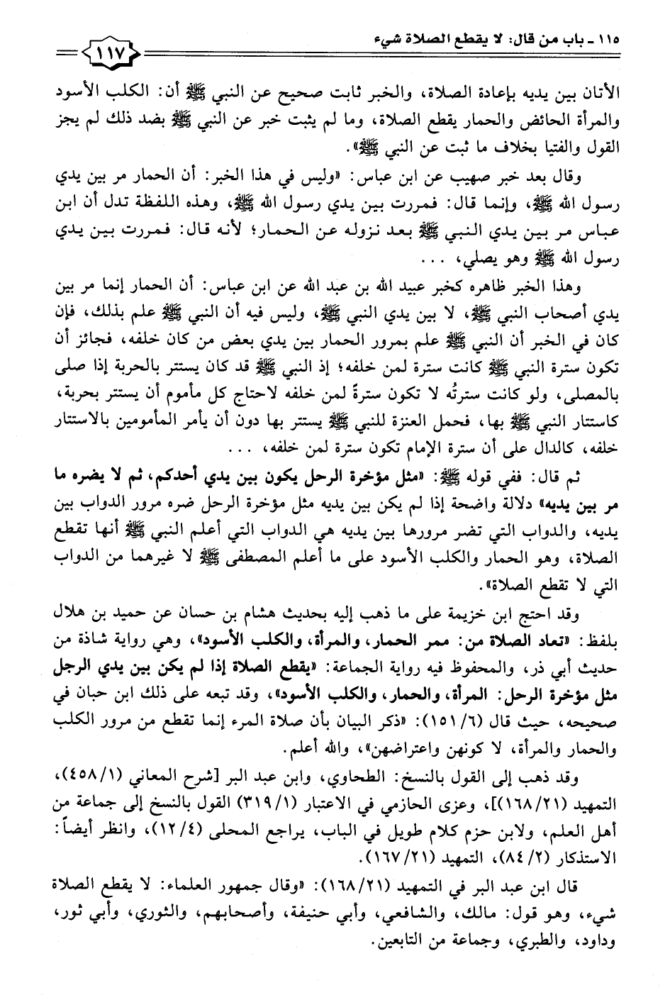 ثم قال: ففي قوله - صلى الله عليه وسلم -: "مثل مؤخرة الرحل يكون بين يدي أحدكم، ثم لا يضره ما مر بين يديه" دلالة واضحة إذا لم يكن بين يديه مثل مؤخرة الرحل ضره مرور الدواب بين يديه، والدواب التي تضر مرورها بين يديه هي الدواب التي أعلم النبي - صلى الله عليه وسلم - أنها تقطع الصلاة، وهو الحمار والكلب الأسود على ما أعلم المصطفى - صلى الله عليه وسلم - لا غيرهما من الدواب التي لا تقطع الصلاة".