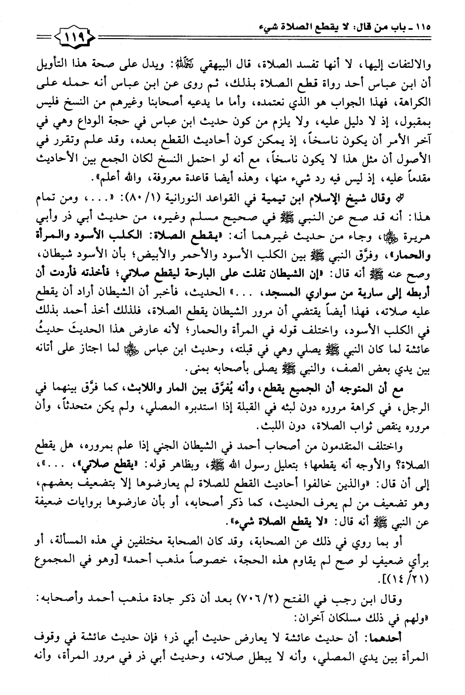 واختلف المتقدمون من أصحاب أحمد في الشيطان الجني إذا علم بمروره، هل يقطع الصلاة؟ والأوجه أنه يقطعها؛ بتعليل رسول الله - صلى الله عليه وسلم -، وبظاهر قوله: "يقطع صلاتي"، ... "، إلى أن قال: "والذين خالفوا أحاديث القطع للصلاة لم يعارضوها إلا بتضعيف بعضهم، وهو تضعيف من لم يعرف الحديث، كما ذكر أصحابه، أو بأن عارضوها بروايات ضعيفة عن النبي - صلى الله عليه وسلم - أنه قال: "لا يقطع الصلاة شيء".