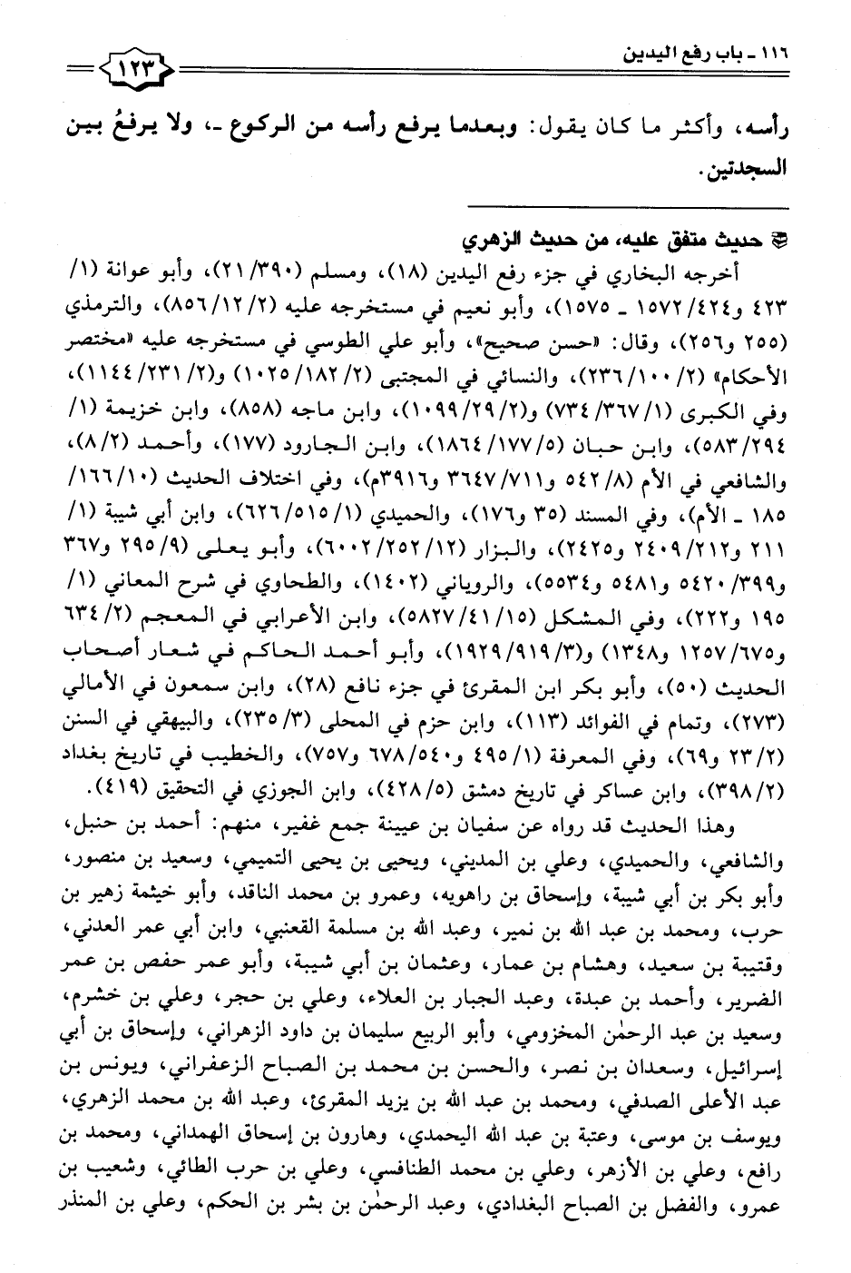 أخرجه البخاري في جزء رفع اليدين (١٨)، ومسلم (٣٩٠/ ٢١)، وأبو عوانة (١/ ٤٢٣ و ٤٢٤/ ١٥٧٢ - ١٥٧٥)، وأبو نعيم في مستخرجه عليه (٢/ ١٢/ ٨٥٦)، والترمذي (٢٥٥ و ٢٥٦)، وقال: "حسن صحيح"، وأبو علي الطوسي في مستخرجه عليه "مختصر الأحكام" (٢/ ١٠٠ / ٢٣٦)، والنسائي في المجتبى (٢/ ١٨٢/ ١٠٢٥) و (٢/ ٢٣١/ ١١٤٤)، وفي الكبرى (١/ ٣٦٧/ ٧٣٤) و (٢/ ٢٩/ ١٠٩٩)، وابن ماجه (٨٥٨)، وابن خزيمة (١/ ٢٩٤/ ٥٨٣)، وابن حبان (٥/ ١٧٧/ ١٨٦٤)، وابن الجارود (١٧٧)، وأحمد (٢/ ٨)، والشافعي في الأم (٨/ ٥٤٢ و ٧١١/ ٣٦٤٧ و ٣٩١٦ م)، وفي اختلاف الحديث (١٠/ ١٦٦/ ١٨٥ - الأم)، وفي المسند (٣٥ و ١٧٦)، والحميدي (١/ ٥١٥/ ٦٢٦)، وابن أبي شيبة (١/ ٢١١ و ٢١٢/ ٢٤٠٩ و ٢٤٢٥)، والبزار (١٢/ ٢٥٢/ ٦٠٠٢)، وأبو يعلى (٩/ ٢٩٥ و ٣٦٧ و ٣٩٩/ ٥٤٢٠ و ٥٤٨١ و ٥٥٣٤)، والروياني (١٤٠٢)، والطحاوي في شرح المعاني (١/ ١٩٥ و ٢٢٢)، وفي المشكل (١٥/ ٤١ / ٥٨٢٧)، وابن الأعرابي في المعجم (٢/ ٦٣٤ و ٦٧٥/ ١٢٥٧ و ١٣٤٨) و (٣/ ٩١٩/ ١٩٢٩)، وأبو أحمد الحاكم في شعار أصحاب الحديث (٥٠)، وأبو بكر ابن المقرئ في جزء نافع (٢٨)، وابن سمعون في الأمالي (٢٧٣)، وتمام في الفوائد (١١٣)، وابن حزم في المحلى (٣/ ٢٣٥)، والبيهقي في السنن (٢/ ٢٣ و ٦٩)، وفي المعرفة (١/ ٤٩٥ و ٥٤٠/ ٦٧٨ و ٧٥٧)، والخطيب في تاريخ بغداد (٢/ ٣٩٨)، وابن عساكر في تاريخ دمشق (٥/ ٤٢٨)، وابن الجوزي في التحقيق (٤١٩).