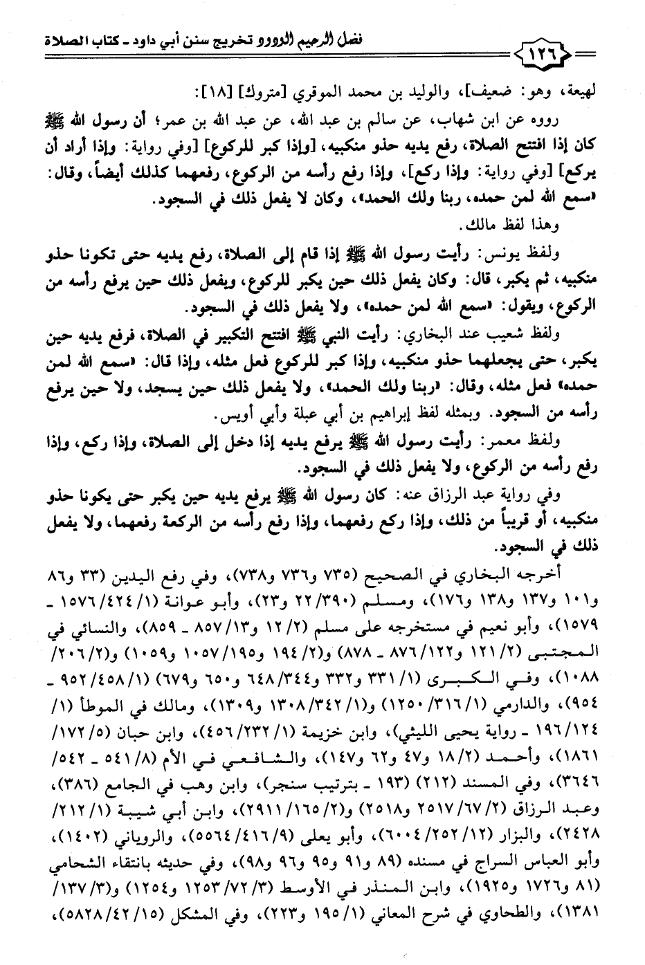 أخرجه البخاري في الصحيح (٧٣٥ و ٧٣٦ و ٧٣٨)، وفي رفع اليدين (٣٣ و ٨٦ و ١٠١ و ١٣٧ و ١٣٨ و ١٧٦)، ومسلم (٣٩٠/ ٢٢ و ٢٣)، وأبو عوانة (١/ ٤٢٤/ ١٥٧٦ - ١٥٧٩)، وأبو نعيم في مستخرجه على مسلم (٢/ ١٢ و ١٣/ ٨٥٧ - ٨٥٩)، والنسائي في المجتبى (٢/ ١٢١ و ١٢٢/ ٨٧٦ - ٨٧٨) و (٢/ ١٩٤ و ١٩٥/ ١٠٥٧ و ١٠٥٩) و (٢/ ٢٠٦/ ١٠٨٨)، وفي الكبرى (١/ ٣٣١ و ٣٣٢ و ٣٤٤/ ٦٤٨ و ٦٥٠ و ٦٧٩) (١/ ٤٥٨/ ٩٥٢ - ٩٥٤)، والدارمي (١/ ٣١٦/ ١٢٥٠) و (١/ ٣٤٢/ ١٣٠٨ و ١٣٠٩)، ومالك في الموطأ (١/ ١٢٤/ ١٩٦ - رواية يحيى الليثي)، وابن خزيمة (١/ ٢٣٢/ ٤٥٦)، وابن حبان (٥/ ١٧٢/ ١٨٦١)، وأحمد (٢/ ١٨ و ٤٧ و ٦٢ و ١٤٧)، والشافعي في الأم (٨/ ٥٤١ - ٥٤٢/ ٣٦٤٦)، وفي المسند (٢١٢) (١٩٣ - بترتيب سنجر)، وابن وهب في الجامع (٣٨٦)، وعبد الرزاق (٢/ ٦٧/ ٢٥١٧ و ٢٥١٨) و (٢/ ١٦٥/ ٢٩١١)، وابن أبي شيبة (١/ ٢١٢/ ٢٤٢٨)، والبزار (١٢/ ٢٥٢/ ٦٠٠٤)، وأبو يعلى (٩/ ٤١٦/ ٥٥٦٤)، والروياني (١٤٠٢)، وأبو العباس السراج في مسنده (٨٩ و ٩١ و ٩٥ و ٩٦ و ٩٨)، وفي حديثه بانتقاء الشحامي (٨١ و ١٧٢٦ و ١٩٢٥)، وابن المنذر في الأوسط (٣/ ٧٢/ ١٢٥٣ و ١٢٥٤) و (٣/ ١٣٧/ ١٣٨١)، والطحاوي في شرح المعاني (١/ ١٩٥ و ٢٢٣)، وفي المشكل (١٥/ ٤٢/ ٥٨٢٨)،