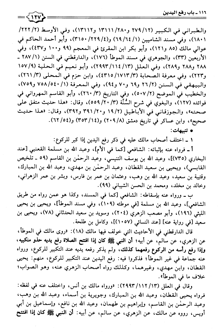 قال الدارقطني في الأحاديث التي خولف فيها مالك (١٨): "روى مالك في الموطأ، عن الزهري، عن سالم، عن أبيه؛ أن النبي - صلى الله عليه وسلم - كان إذا افتتح الصلاة رفع يديه حذو منكبيه، وإذا رفع رأسه من الركوع رفعهما كذلك، ولم يذكر رفعه يديه عند التكبير للركوع، ورواه عنه جماعة في غير الموطأ؛ فذكروا فيه: رفع اليدين عند التكبير للركوع، منهم: يحيى القطان، وابن مهدي، وغيرهما، وكذلك رواه أصحاب الزهري عنه، وهو الصواب؛ خلاف ما في الموطأ".