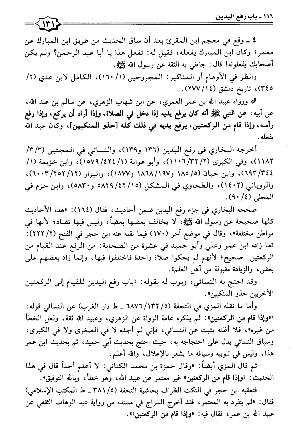 وأما ما نقله المزي في التحفة (٥/ ٦٨٧٦/١٣٢ - ط دار الغرب) عن النسائي قوله: ""وإذا قام من الركعتين": لم يذكره عامة الرواة عن الزهري، وعبيد الله ثقة، ولعل الخطأ من غيره"، فلا أظنه يثبت عن النسائي، فإني لم أجده لا في الصغرى ولا في الكبرى، وسياق النسائي يدل على احتجاجه به، حيث احتج بحديث أبي حميد، ثم بحديث ابن عمر هذا، وليس في تبويبه وسياقه ما يشعر بالإعلال، والله أعلم.