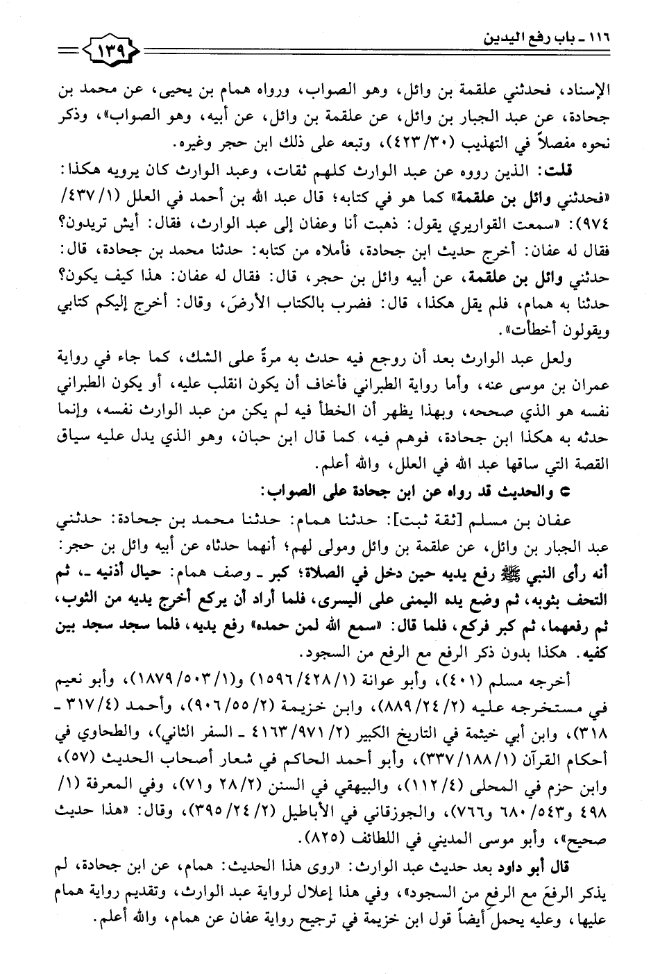 عفان بن مسلم [ثقة ثبت]: حدثنا همام: حدثنا محمد بن جحادة: حدثني عبد الجبار بن وائل، عن علقمة بن وائل ومولى لهم؛ أنهما حدثاه عن أبيه وائل بن حجر: أنه رأى النبي - صلى الله عليه وسلم - رفع يديه حين دخل في الصلاة؛ كبر -وصف همام: حيال أذنيه-، ثم التحف بثوبه، ثم وضع يده اليمنى على اليسرى، فلما أراد أن يركع أخرج يديه من الثوب، ثم رفعهما، ثم كبر فركع، فلما قال: "سمع الله لمن حمده" رفع يديه، فلما سجد سجد بين كفيه. هكذا بدون ذكر الرفع مع الرفع من السجود.