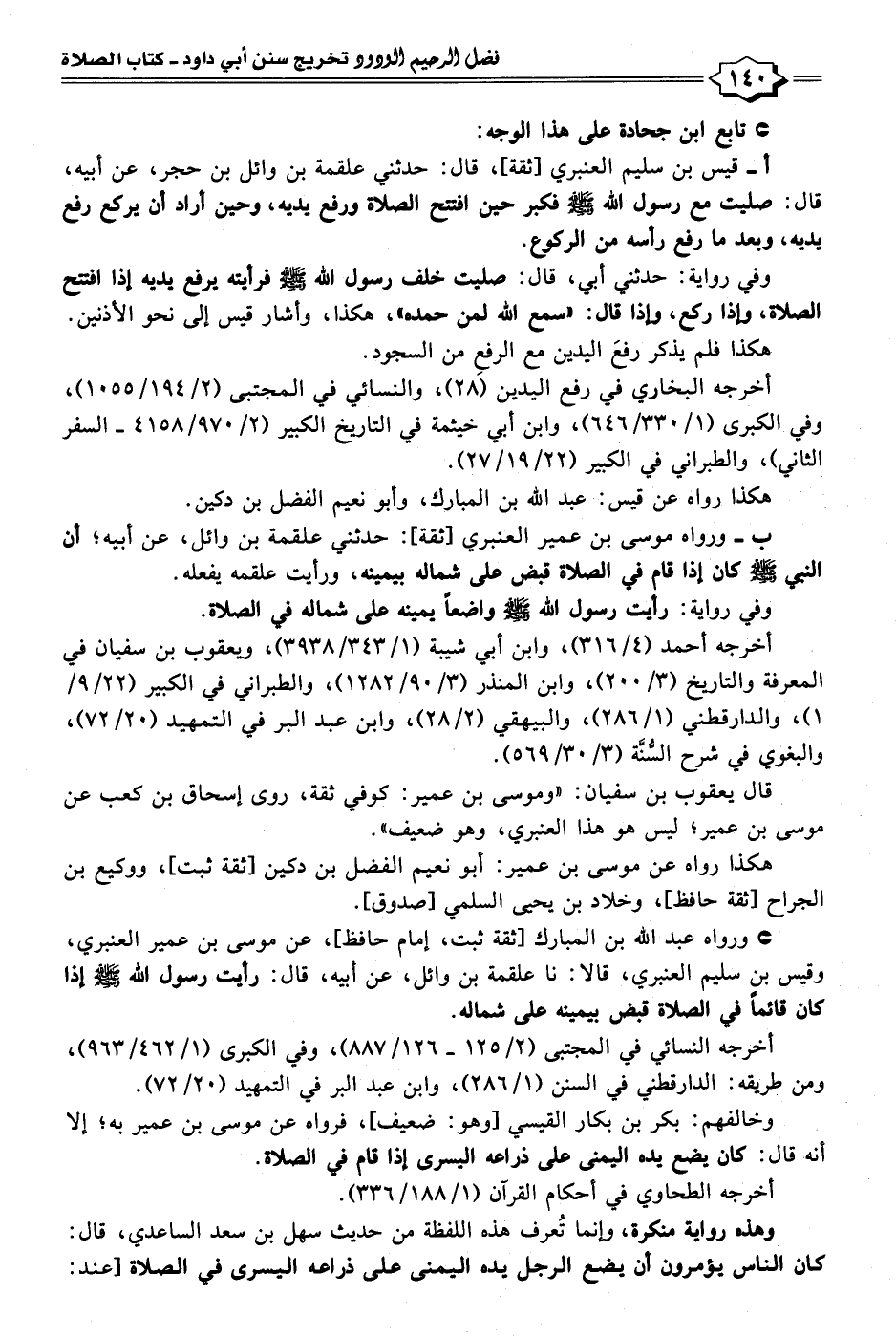 أ - قيس بن سليم العنبري [ثقة]، قال: حدثني علقمة بن وائل بن حجر، عن أبيه، قال: صليت مع رسول الله - صلى الله عليه وسلم - فكبر حين افتتح الصلاة ورفع يديه، وحين أراد أن يركع رفع يديه، وبعد ما رفع رأسه من الركوع.