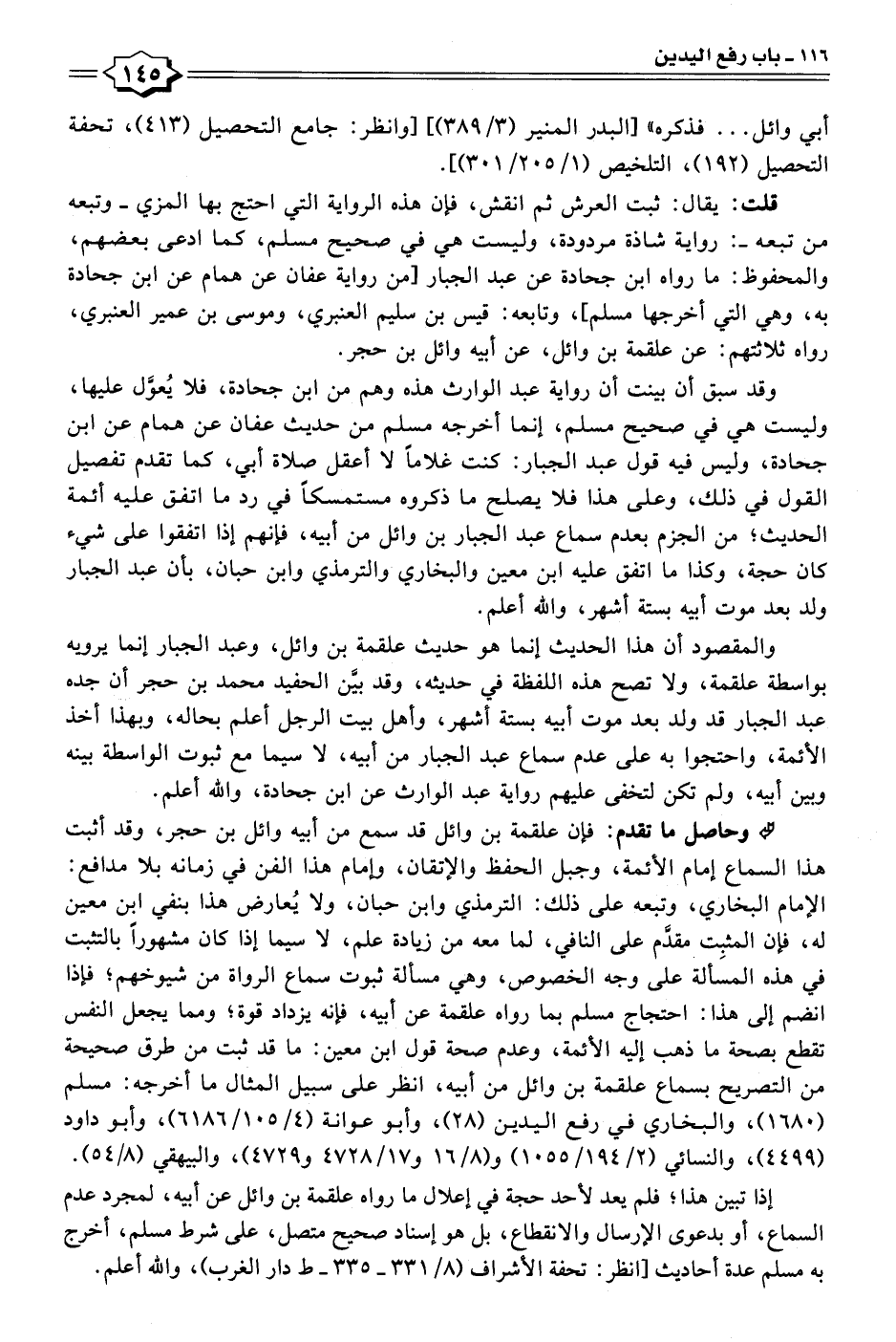 قلت: يقال: ثبت العرش ثم انقش، فإن هذه الرواية التي احتج بها المزي -وتبعه من تبعه-: رواية شاذة مردودة، وليست هي في صحيح مسلم، كما ادعى بعضهم، والمحفوظ: ما رواه ابن جحادة عن عبد الجبار [من رواية عفان عن همام عن ابن جحادة به، وهي التي أخرجها مسلم]، وتابعه: قيس بن سليم العنبري، وموسى بن عمير العنبري، رواه ثلاثتهم: عن علقمة بن وائل، عن أبيه وائل بن حجر.