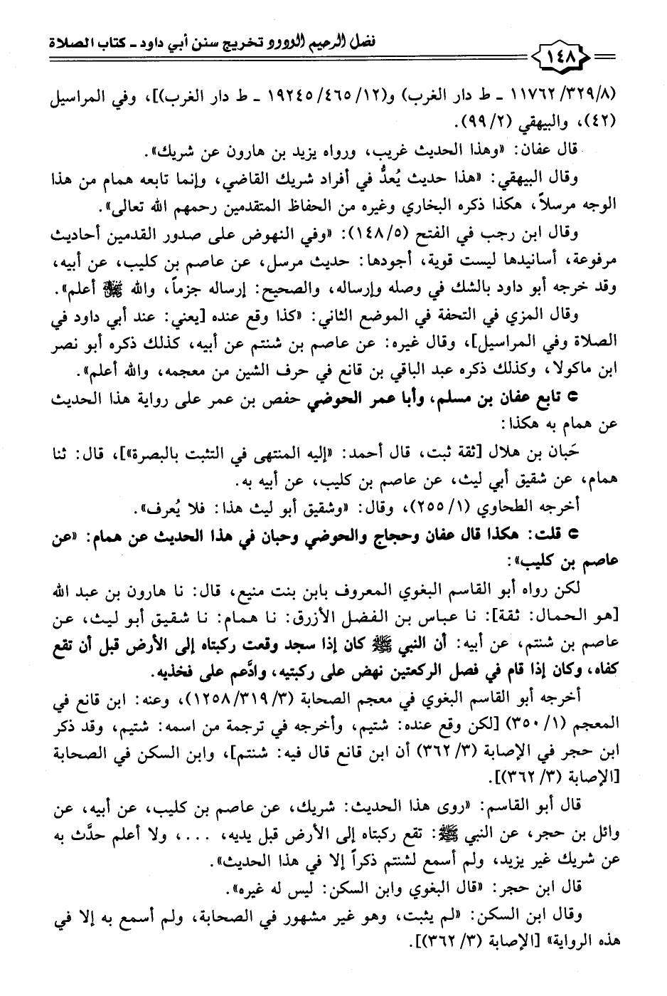 لكن رواه أبو القاسم البغوي المعروف بابن بنت منيع، قال: نا هارون بن عبد الله [هو الحمال: ثقة]: نا عباس بن الفضل الأزرق: نا همام: نا شقيق أبو ليث، عن عاصم بن شنتم، عن أبيه: أن النبي - صلى الله عليه وسلم - كان إذا سجد وقعت ركبتاه إلى الأرض قبل أن تقع كفاه، وكان إذا قام في فصل الركعتين نهض على ركبتيه، وادَّعم على فخديه.