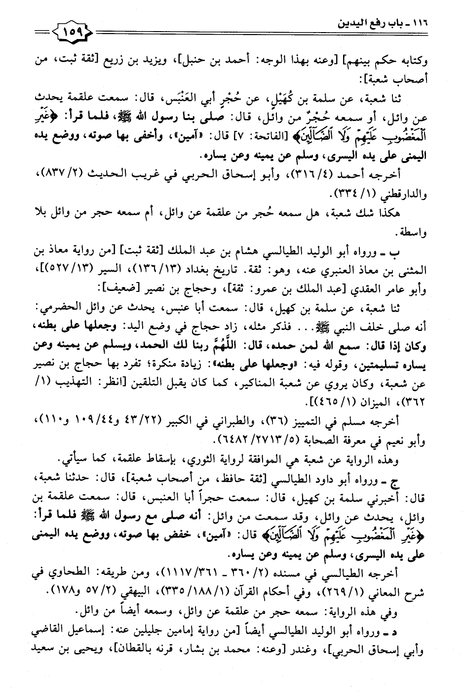 ج - ورواه أبو داود الطيالسي [ثقة حافظ، من أصحاب شعبة]، قال: حدثنا شعبة، قال: أخبرني سلمة بن كهيل، قال: سمعت حجرًا أبا العنبس، قال: سمعت علقمة بن وائل، يحدث عن وائل، وقد سمعت من وائل: أنه صلى مع رسول الله - صلى الله عليه وسلم - فلما قرأ: {غَيْرِ الْمَغْضُوبِ عَلَيْهِمْ وَلَا الضَّالِّينَ} قال: "آمين"، خفض بها صوته، ووضع يده اليمنى على يده اليسرى، وسلم عن يمينه وعن يساره.