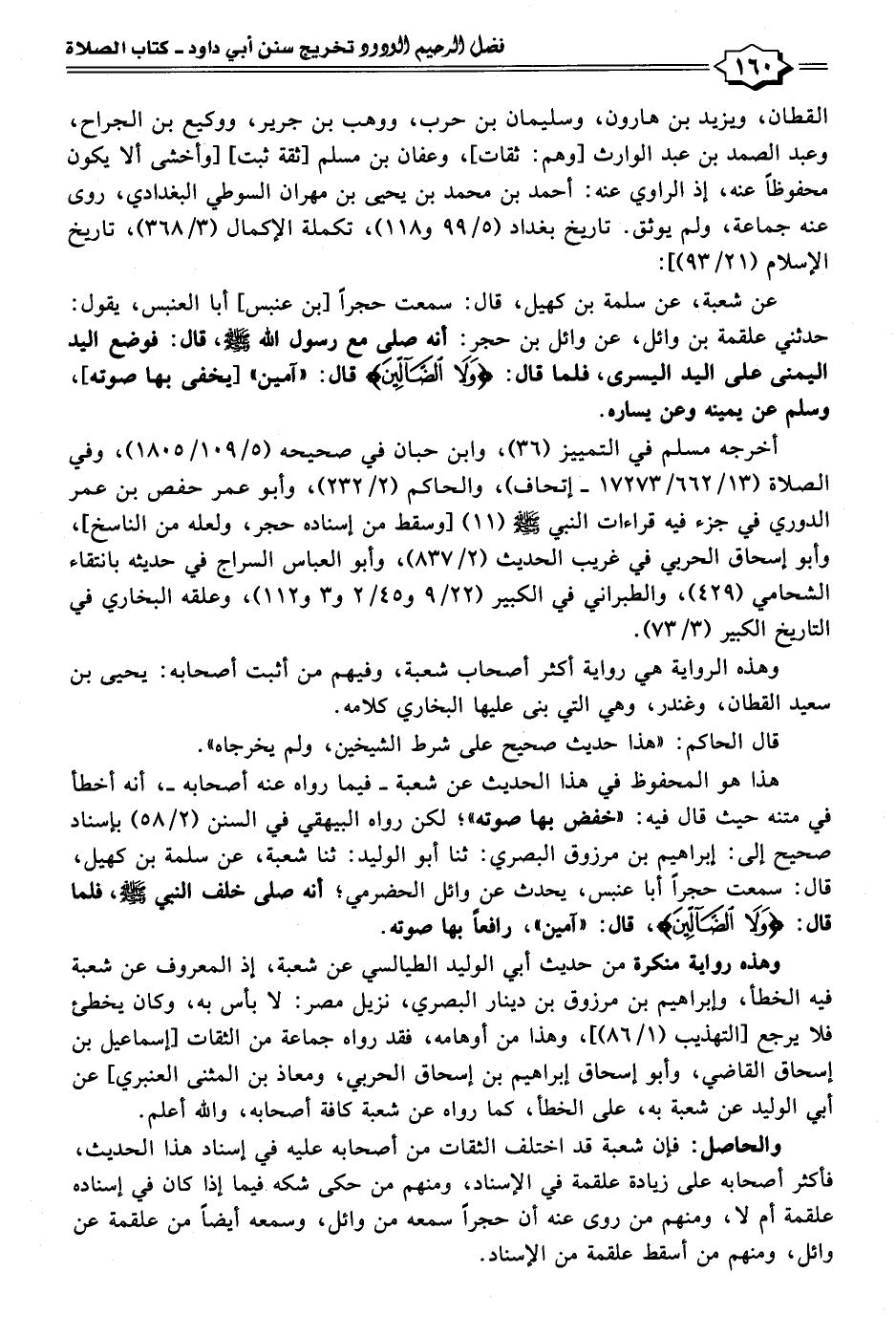 عن شعبة، عن سلمة بن كهيل، قال: سمعت حجرًا [بن عنبس] أبا العنبس، يقول: حدثني علقمة بن وائل، عن وائل بن حجر: أنه صلى مع رسول الله - صلى الله عليه وسلم -، قال: فوضع اليد اليمنى على اليد اليسرى، فلما قال: {وَلَا الضَّالِّينَ} قال: "آمين" [يخفى بها صوته]، وسلم عن يمينه وعن يساره.