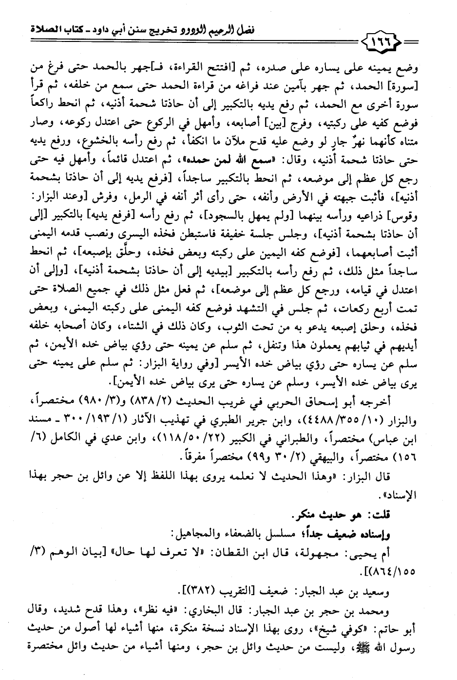 ومحمد بن حجر بن عبد الجبار: قال البخاري: "فيه نظر"، وهذا قدح شديد، وقال أبو حاتم: "كوفي شيخ"، روى بهذا الإسناد نسخة منكرة، منها أشياء لها أصول من حديث رسول الله - صلى الله عليه وسلم -، وليست من حديث وائل بن حجر، ومنها أشياء من حديث وائل مختصرة