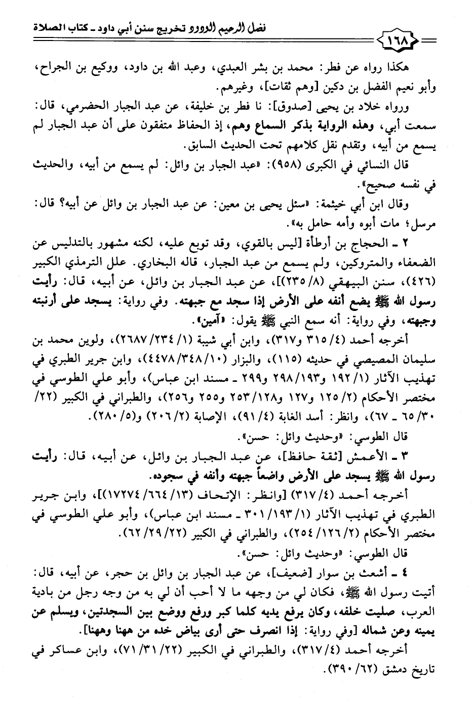 ٣ - الأعمش [ثقة حافظ]، عن عبد الجبار بن وائل، عن أبيه، قال: رأيت رسول الله - صلى الله عليه وسلم - يسجد على الأرض واضعًا جبهته وأنفه في سجوده.