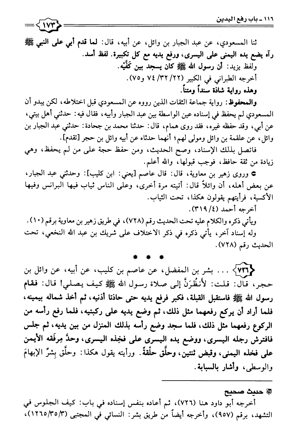 ٧٢٦ - . . . بشر بن المفضل، عن عاصم بن كليب، عن أبيه، عن وائل بن حجر، قال: قلت: لأَنظُرَنَّ إلى صلاة رسول الله - صلى الله عليه وسلم - كيف يصلي! قال: فقام رسول الله - صلى الله عليه وسلم - فاستقبل القبلة، فكبر فرفع يديه حتى حاذتا أذنيه، ثم أخذ شماله بيمينه، فلما أراد أن يركع رفعهما مثل ذلك، ثم وضع يديه على ركبتيه، فلما رفع رأسه من الركوع رفعهما مثل ذلك، فلما سجد وضع رأسه بذلك المنزل من بين يديه، ثم جلس فافترش رجله البسرى، ووضع بده اليسرى على فخِذه اليسرى، وحدَّ مِرفَقه الأيمن على فخذه اليمنى، وقبض ثنتين، وحلَّق حلْقةً. ورأيته يقول هكذا: وحلَّق بِشرٌ الإبهامَ والوسطى، وأشار بالسبابة.
