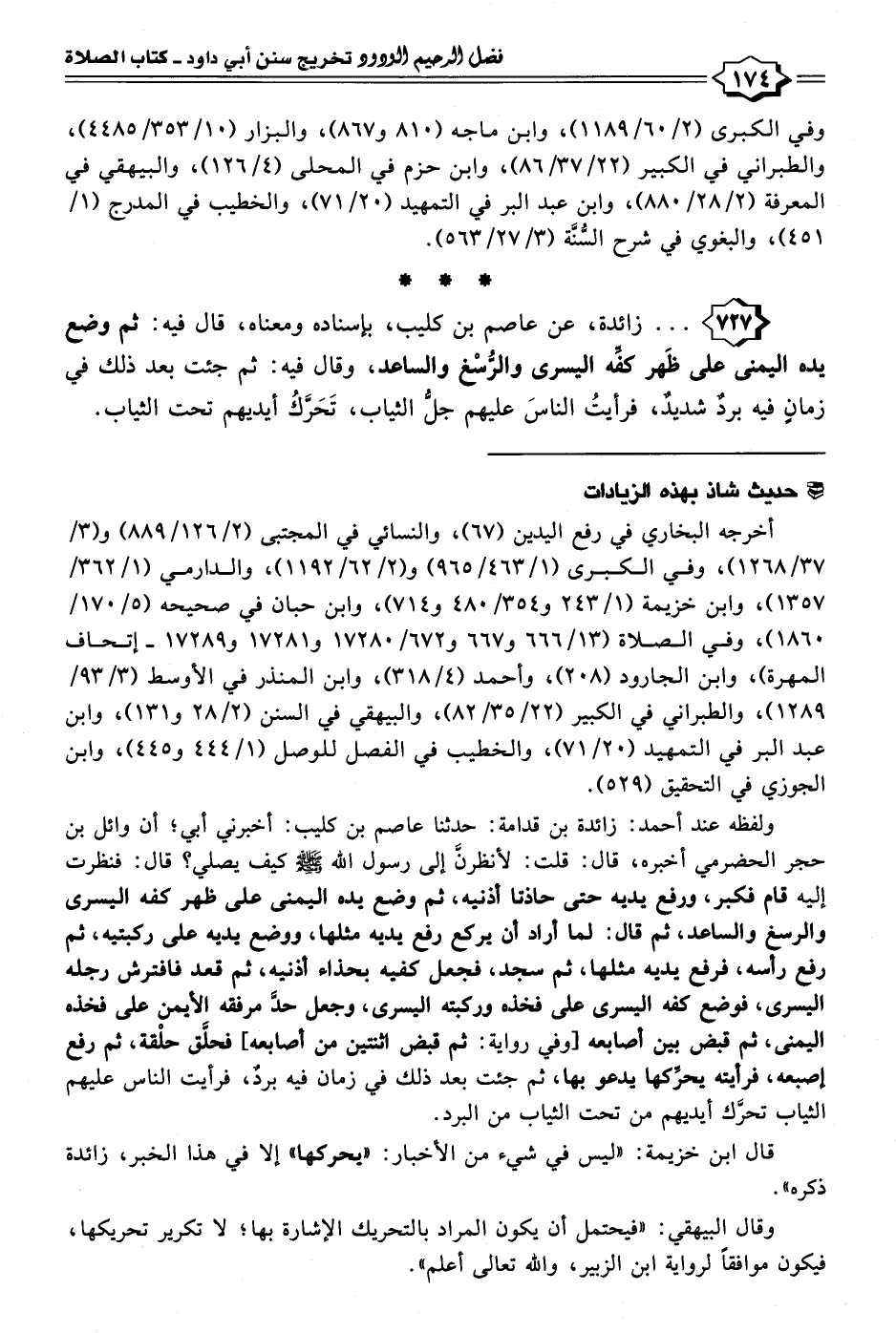 ٧٢٧ - . . . زائدة، عن عاصم بن كليب، بإسناده ومعناه، قال فيه: ثم وضع يده اليمنى على ظَهر كفِّه اليسرى والرُّسْغ والساعد، وقال فيه: ثم جئت بعد ذلك في زمانٍ فيه بردٌ شديدٌ، فرأيتُ الناسَ عليهم جلُّ الثياب، تَحَرَّكُ أيديهم تحت الثياب.