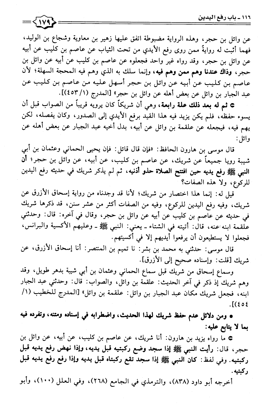 • ثم له بعد ذلك علة رابعة، وهي أن شريكًا كان يرويه قريبًا من الصواب قبل أن يسوء حفظه، فلم يكن يزيد فيه هذا القيد برفع الأيدي إلى الصدور، وكان يفصله، لكن يهم فيه، فيجعله عن علقمة بن وائل عن أبيه، بدل أخيه عبد الجبار عن بعض أهله عن وائل: