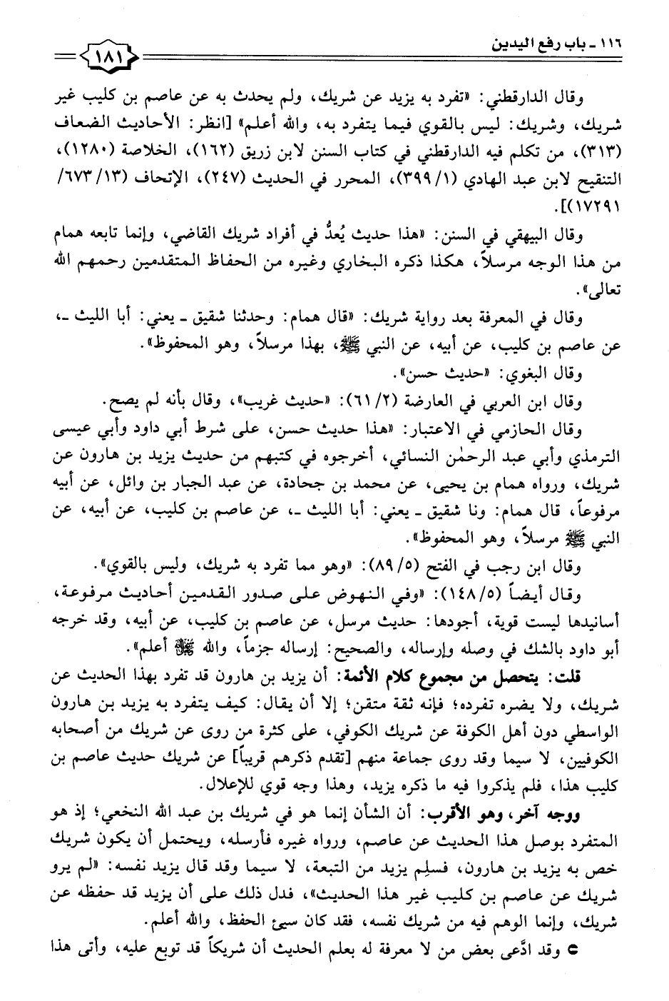 قلت: يتحصل من مجموع كلام الأئمة: أن يزيد بن هارون قد تفرد بهذا الحديث عن شريك، ولا يضره تفرده؛ فإنه ثقة متقن؛ إلا أن يقال: كيف يتفرد به يزيد بن هارون الواسطي دون أهل الكوفة عن شريك الكوفي، على كثرة من روى عن شريك من أصحابه الكوفيين، لا سيما وقد روى جماعة منهم [تقدم ذكرهم قريبًا]، عن شريك حديث عاصم بن كليب هذا، فلم يذكروا فيه ما ذكره يزيد، وهذا وجه قوي للإعلال.