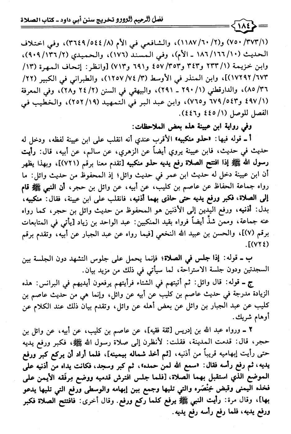 ج - قوله: قال وائل: ثم أتيتهم في الشتاء فرأيتهم يرفعون أيديهم في البرانس: هذه الزيادة مدرجة في حديث عاصم بن كليب عن أبيه عن وائل، وإنما هي من حديث عاصم بن كليب عن عبد الجبار بن وائل عن بعض أهله عن وائل، وتقدم كان ذلك عند الكلام عن أوهام شريك.