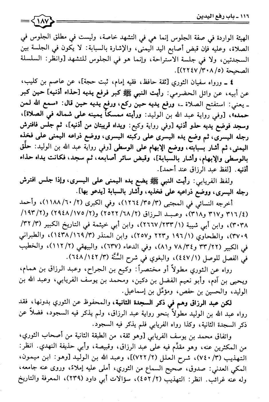 ٤ - ورواه سفيان الثوري [ثقة حافظ، فقيه إمام، ثبت حجة]، عن عاصم بن كليب، عن أبيه، عن وائل الحضرمي: رأيت النبي - صلى الله عليه وسلم - كبر فرفع يديه أحداء أذنيه، حين كبر -يعني: استفتح الصلاة-، ورفع يديه حين ركع، ورفع يديه حين قال: "سمع الله لمن حمده"، [وفي رواية عبد الله بن الوليد: ورأيته ممسكا يمينه على شماله في الصلاة]، وسجد فوضع يديه حذو أذنيه [وفي رواية وكيع: ويداه قريبتان من أذنيه]، ثم جلس فافترش رجله اليسرى، ثم وضع يده اليسرى على ركبته اليسرى، ووضع ذراعه اليمنى على فخذه اليمنى، ثم أشار بسبابته، ووضع الإبهام على الوسطى [وفي رواية عبد الله بن الوليد: حلَّق بالوسطى والإبهام، وأشار بالسبابة]، وقبض سائر أصابعه، ثم سجد، فكانت يداه حذاء أذنيه. [لفظ عبد الرزاق عند أحمد].